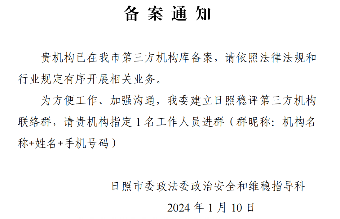 1月:2024年1月10日,公司向日照市委政法委政治安全和维稳指导科完成稳评资质备案。